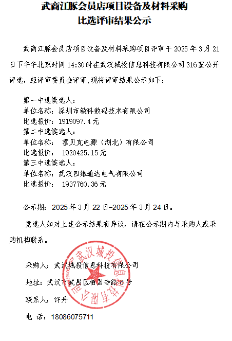 武商江豚会员店项目设备及材料采购比选评审结果公示