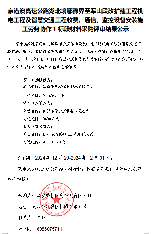 京港澳高速公路湖北境鄂豫界至军山段改扩建工程机电工程及智慧交通工程收费、通信、监控设备安装施工劳务协作1标段材料采购评审结果公示