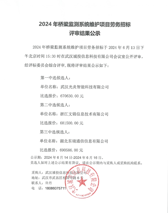 2024 年桥梁监测系统维护项目劳务招标评审结果公示