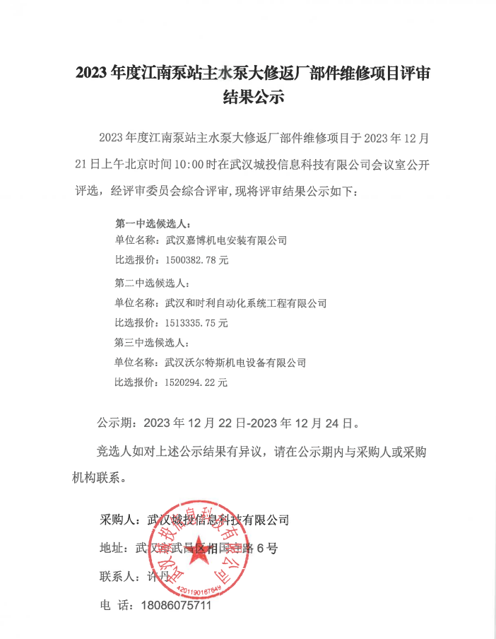 2023年度江南泵站主水泵大修返厂部件维修项目评审结果公示