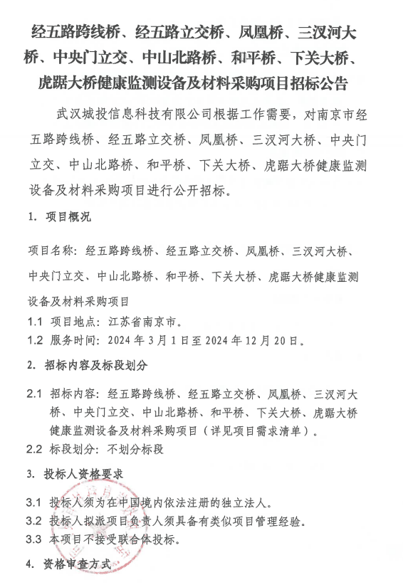 经五路跨线桥、经五路立交桥、凤凰桥、三汉河大桥、中央门立交、中山北路桥、和平桥、下关大桥虎踞大桥健康监测设备及材料采购项目招标公告