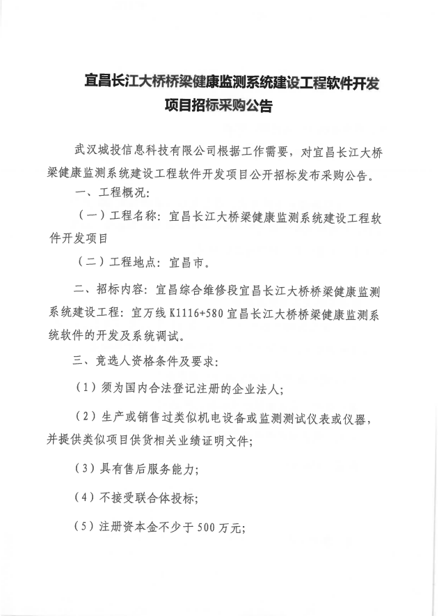 宜昌长江大桥桥梁健康监测系统建设工程软件开发项目招标采购公告