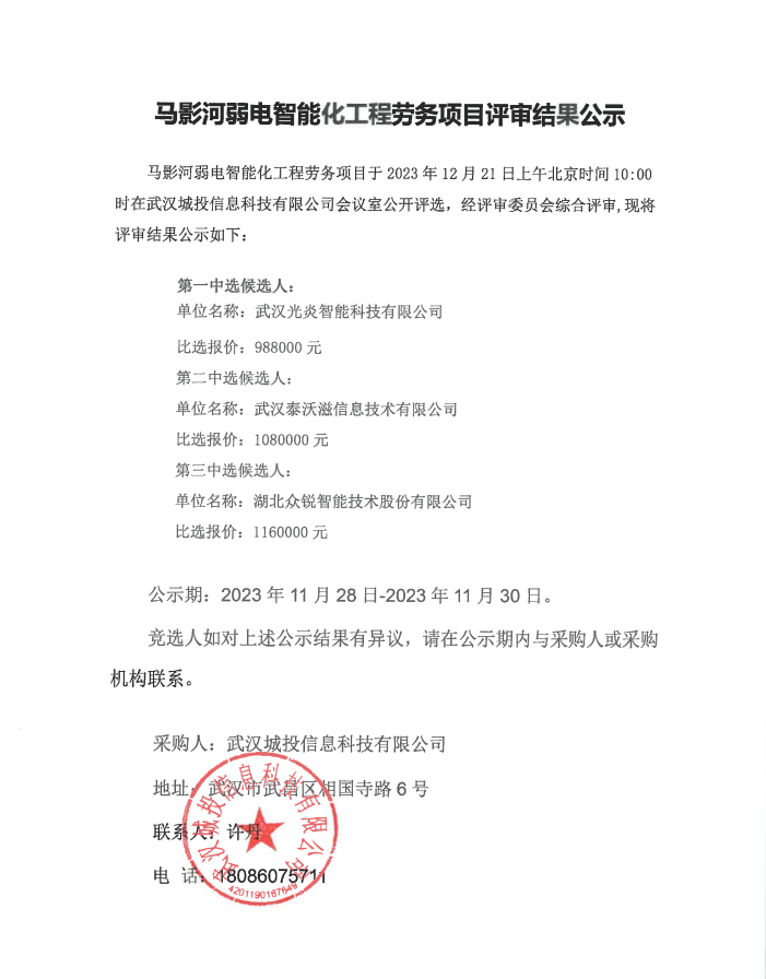 马影河弱电智能化工程劳务项目评审结果公示