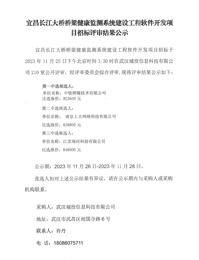 宜昌长江大桥桥梁健康监测系统建设工程软件开发项目招标评审结果公示
