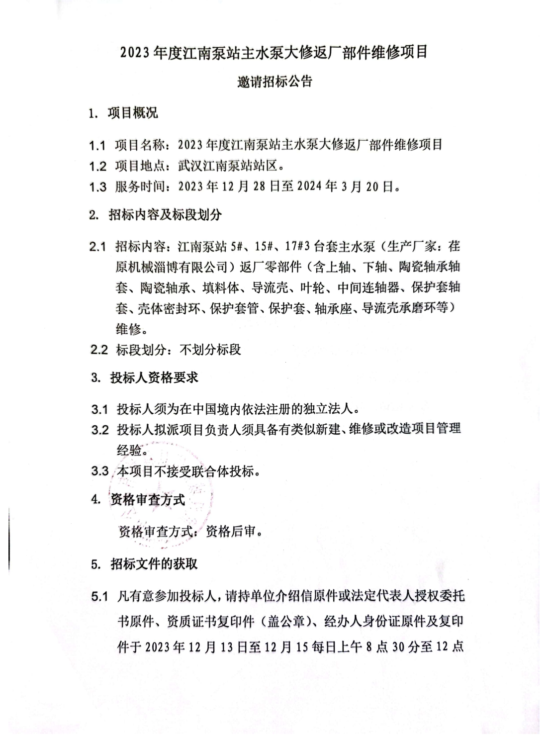 2023年度江南泵站主水泵大修返厂部件维修项目邀请招标公告