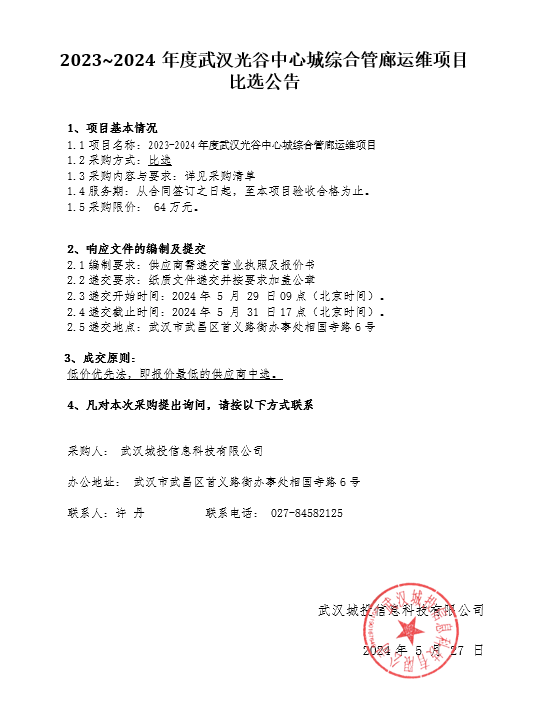 2023~2024年度武汉光谷中心城综合管廊运维项目比选公告