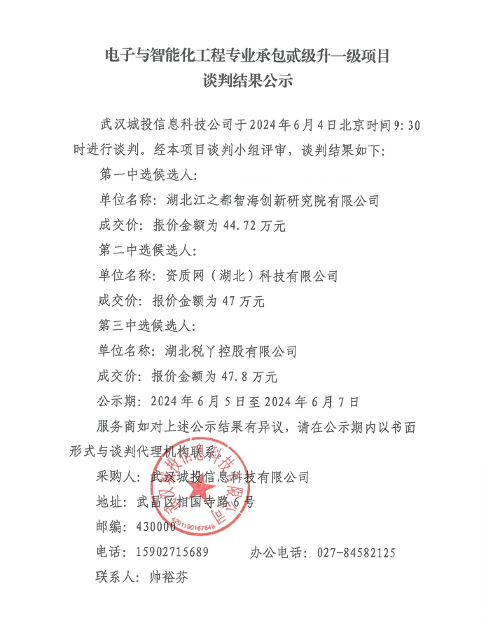 电子与智能化工程专业承包贰级升一级项目谈判结果公示